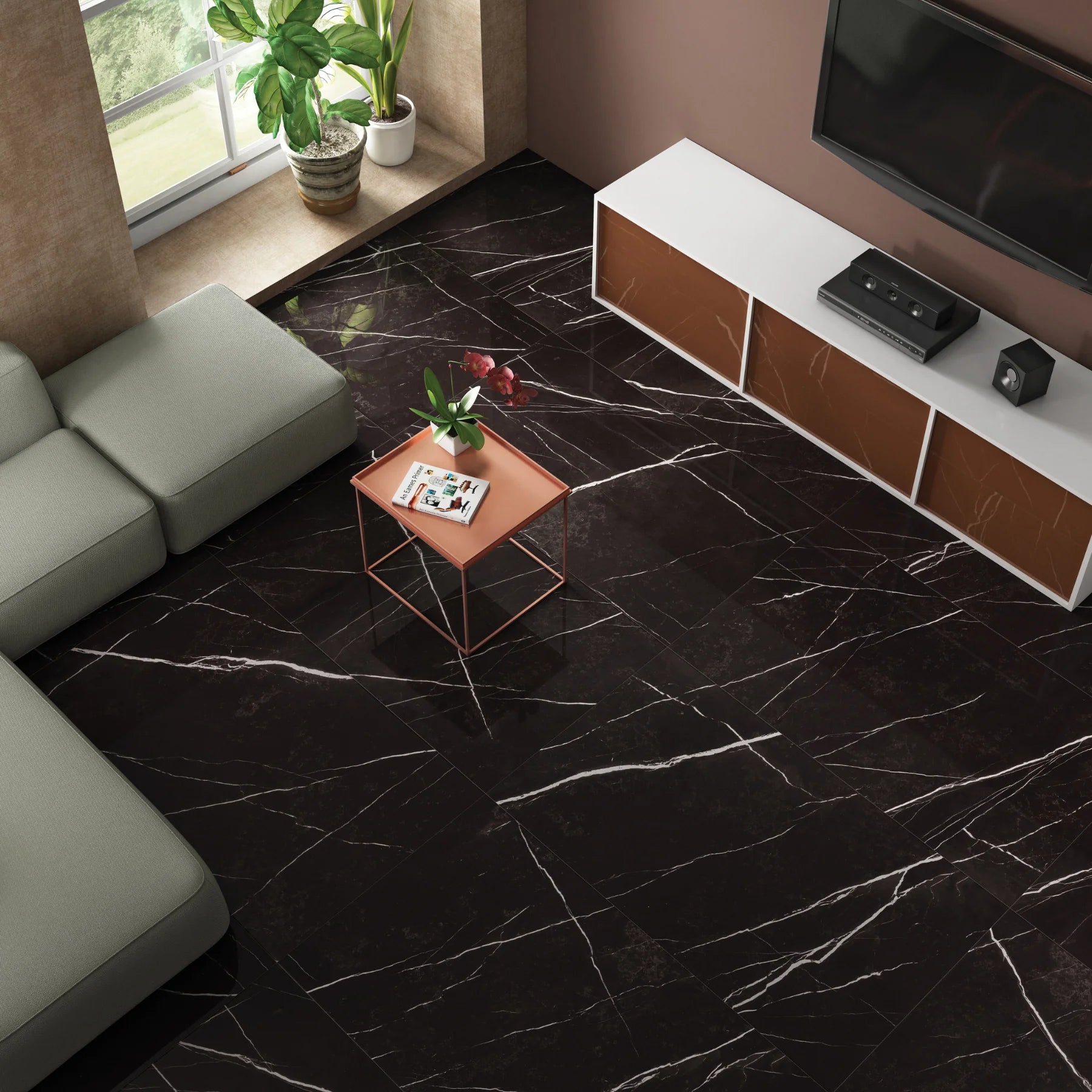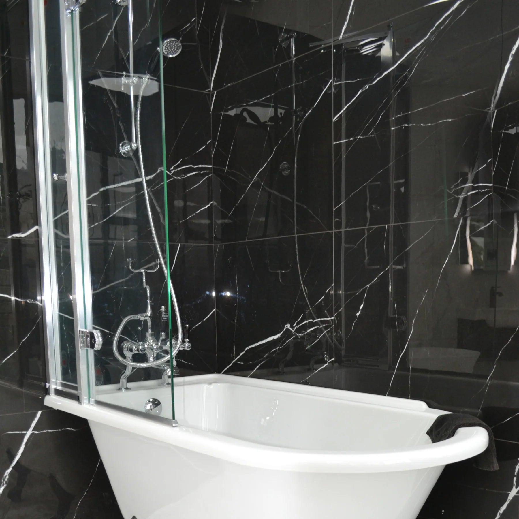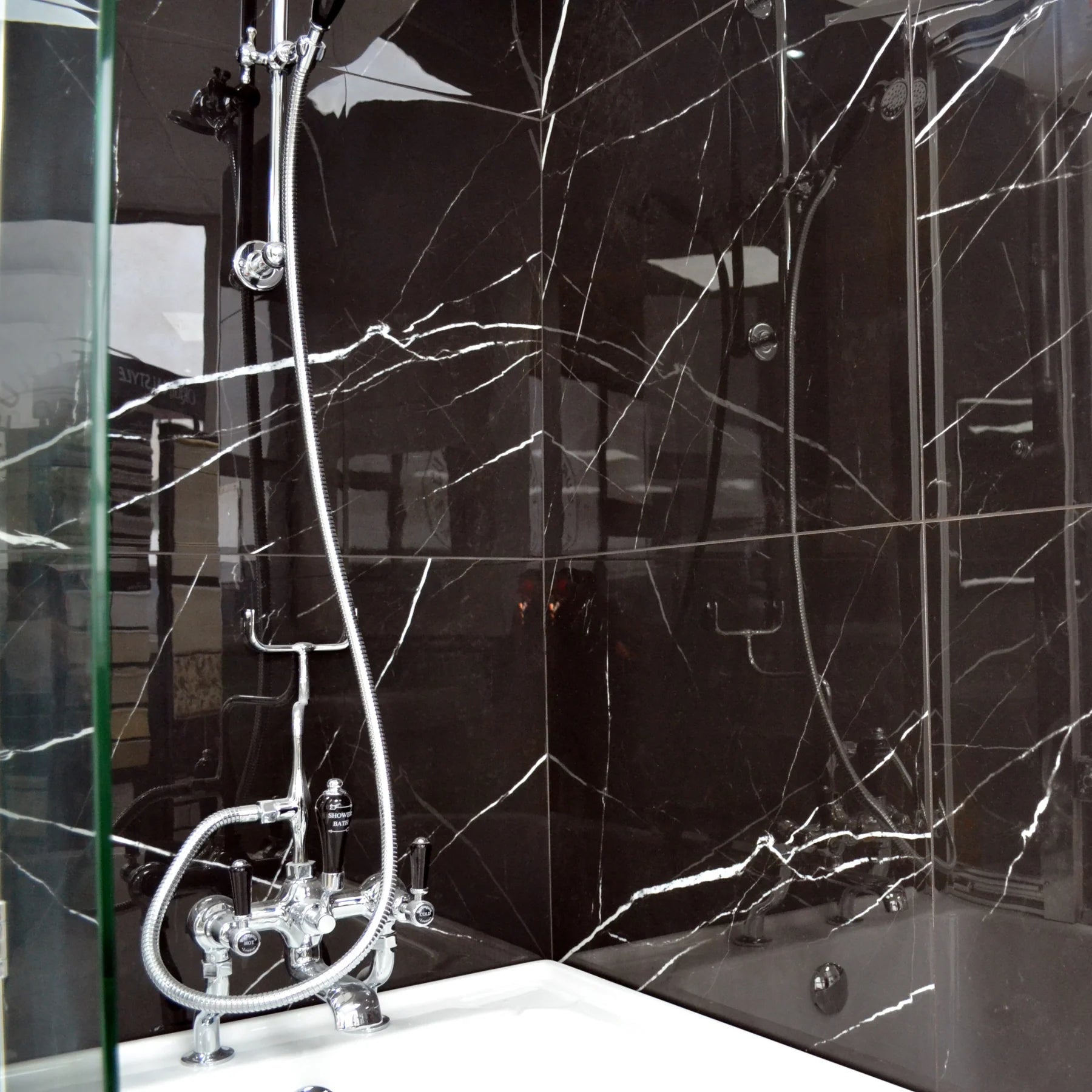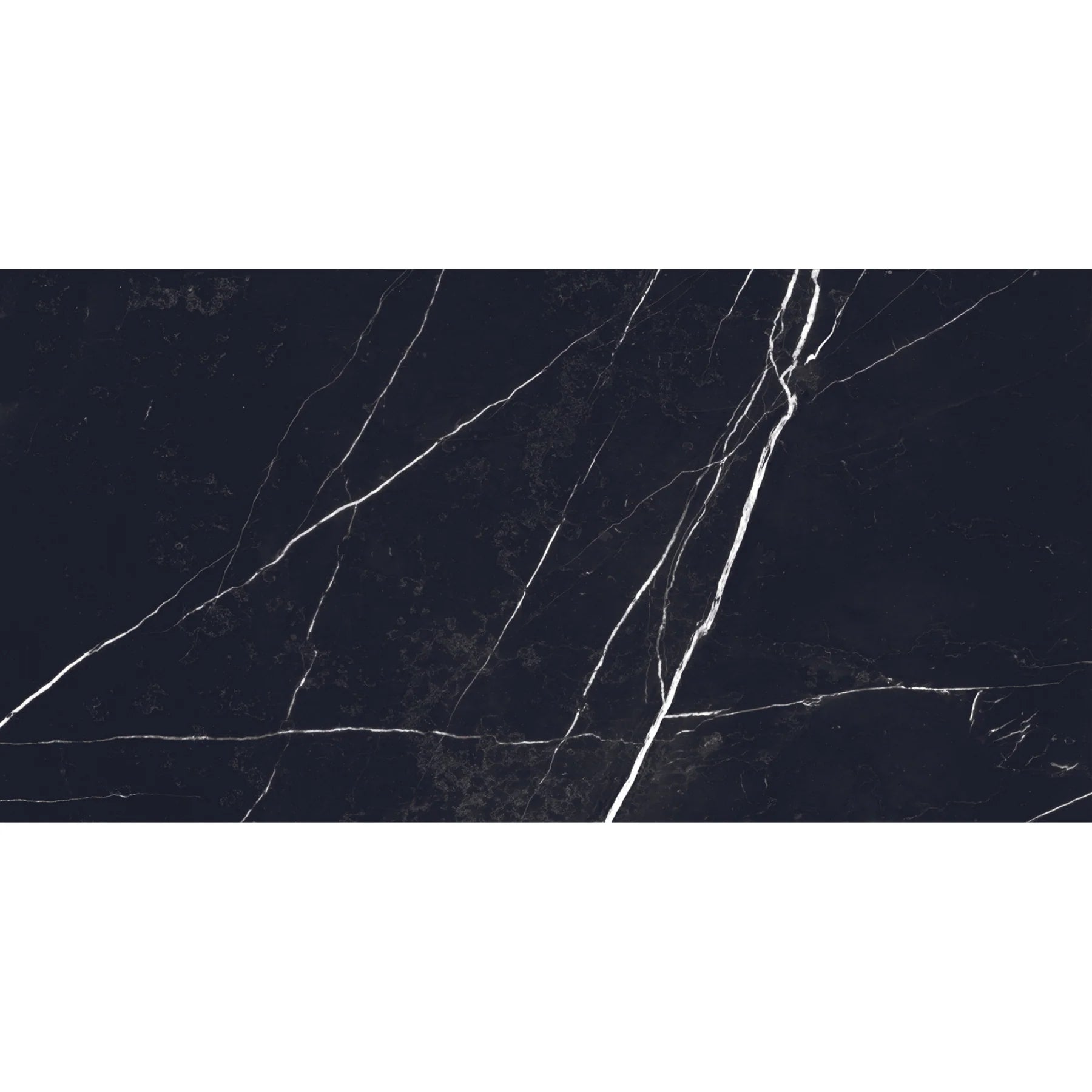 The Superb Marquina polished porcelain tile offers a sleek black finish perfect for both walls and floors in bathroom interiors. Measuring 60x120cm with a 1cm thickness, its six unique faces create a sophisticated, natural look with durability suited for indoor use. Each box contains two tiles, weighing 30.50kg, ideal for stylish, long-lasting installations requiring refined aesthetics and robust performance.